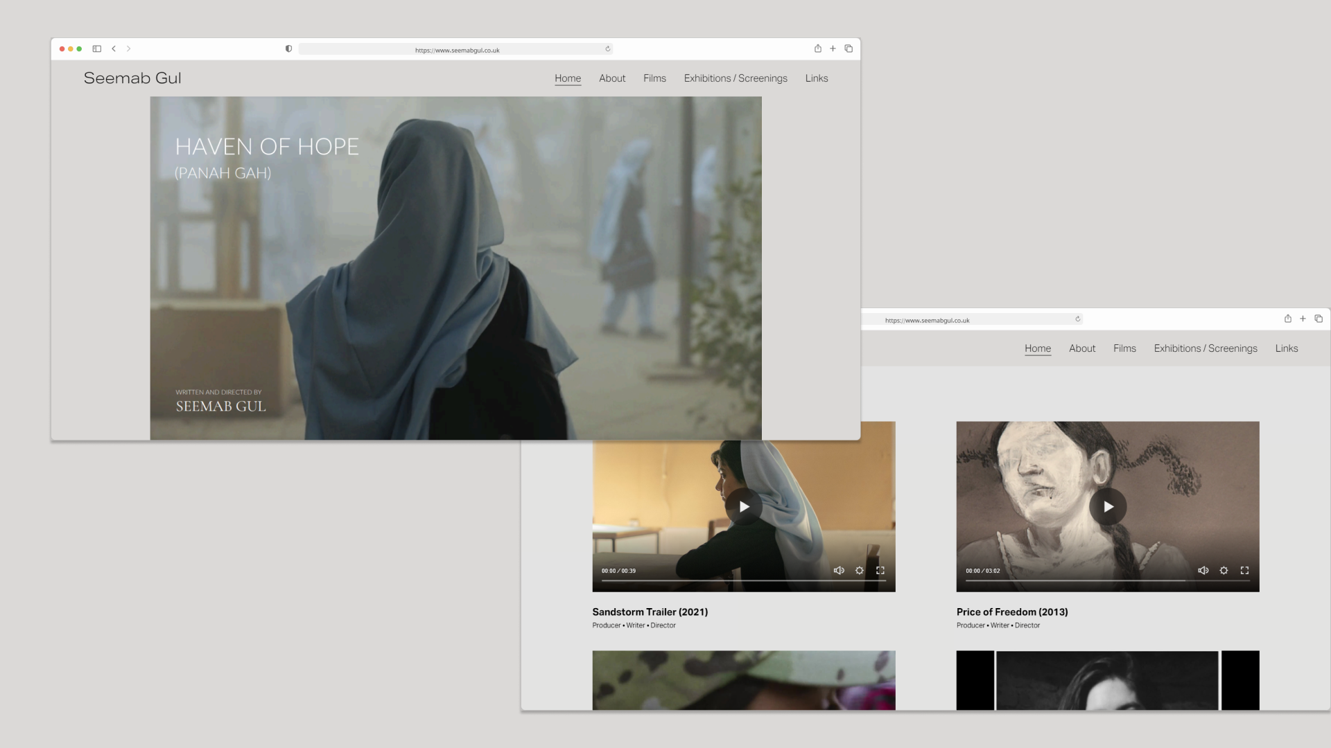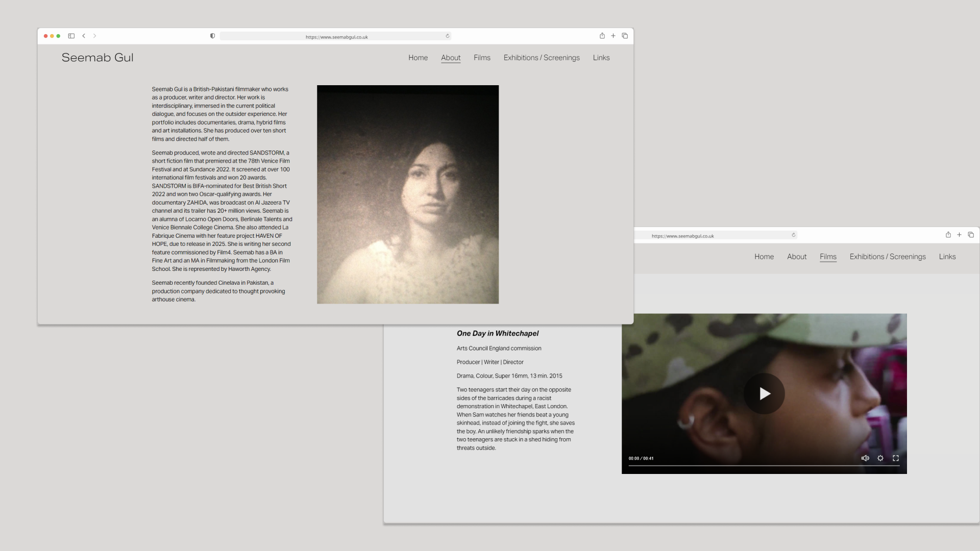 Seemab Gul, a British Pakistani filmmaker residing in London, presents her work through a carefully crafted brand identity and website. Serving as a digital gallery, this platform captures the heart of Seemab’s work and accomplishments. Her work is interdisciplinary, immersed in the current political dialogue, and focuses on the outsider experience.